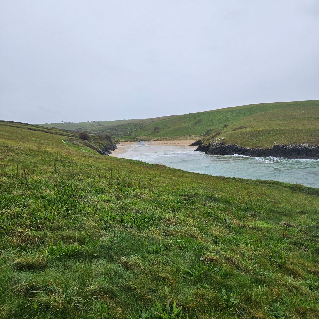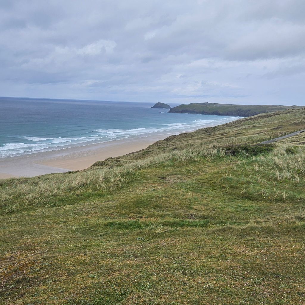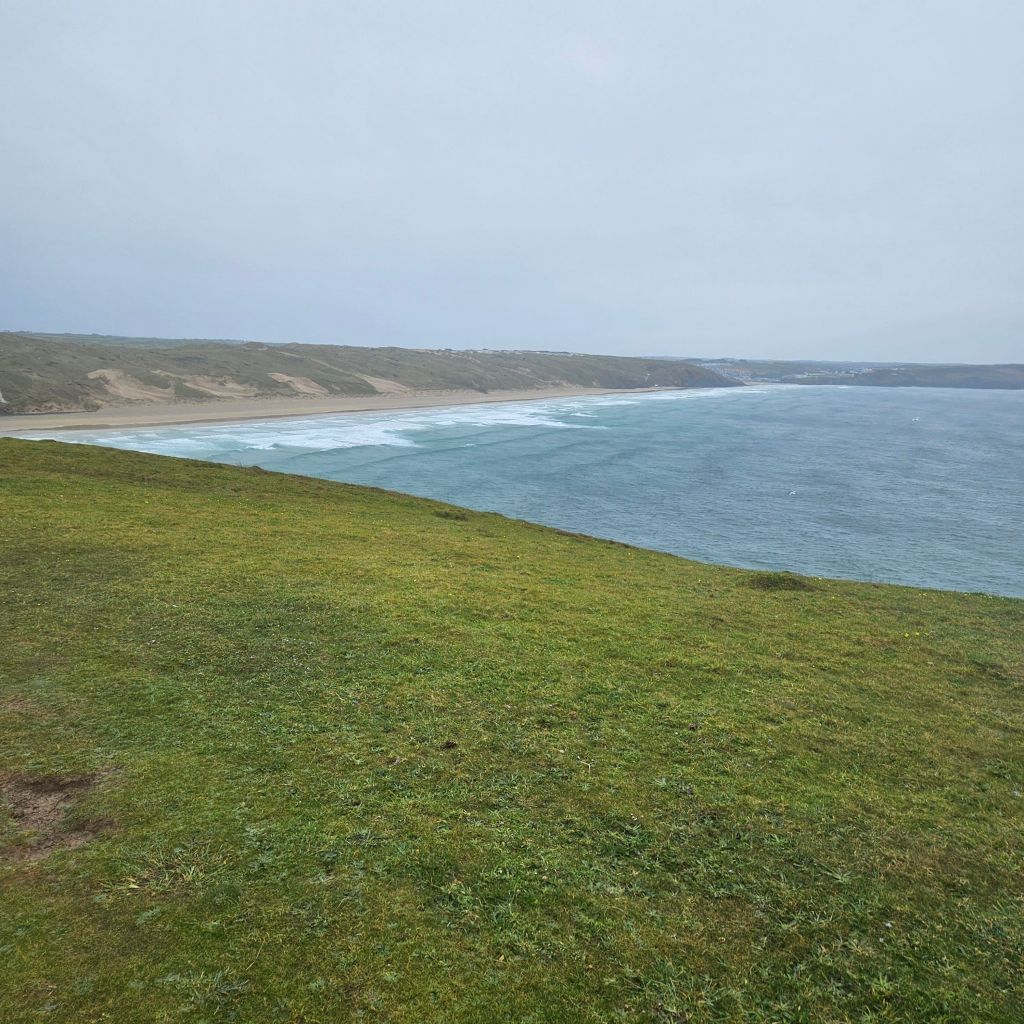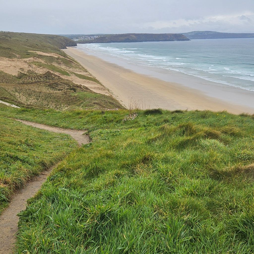 Another wet and windy morning meant the dash at 06.00 to get across the tidal Penpol crossing over the Gannal was not going to happen. Breakfast and then an hour trudging along the main A392 with heavy rain was not exactly lifting my spirits, the other option to missing the tides. But once over The Gannal and into the reed beds, life felt different, tarmac, built form, and people had all gone, and I was back on the very special path. Although the rain was consistant the winds were lighter than yesterday and this makes such a difference. Once past the Southern end of the Penpol crossing the land turns to sand and that was it for the rest of the day. The path generally is solid, and there are areas of coastal pasture but the sand seems to dominate what is a lovely and interesting section. After the lovely Crantock Beach the climb to Pentire Point brings full exposure to the prevailing winds. A drop down to a wonderfully named beach, Porth Joke, up and around Kelsey Head and drop again to Holywell Beach, another fantastic stretch of sand. I meet my first person of the day after nearly two hours, a dog walker braving the elements. A climb to Penhale point, reveals the strange and spooky former army base, Penhale Camp. This provides some interesting distraction as a helicopter is praticing dropping commandos into the camp, lifting and circling, some skill in the wind today. Then onto Penhale Sands, and Perran Beach, two miles long and with dunes up to 150 feet high. The path takes you through the dunes and this is increadibly hard work on dodgy knees. And so it was welcome to round the final dune section and see Perranporth, having past the Haven site that will bring memories back to the mad women campers, not all fond. Soaked to the skin, but with a big smile back on my face, jacket potato with corrination chicken and roasted peppers warms the heart. Bed for the night is a self catered converted garage, quirky, but just perfect. Goodnight.