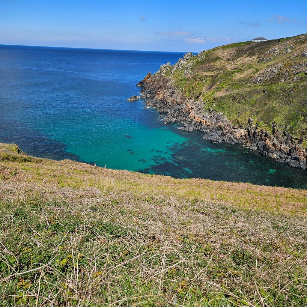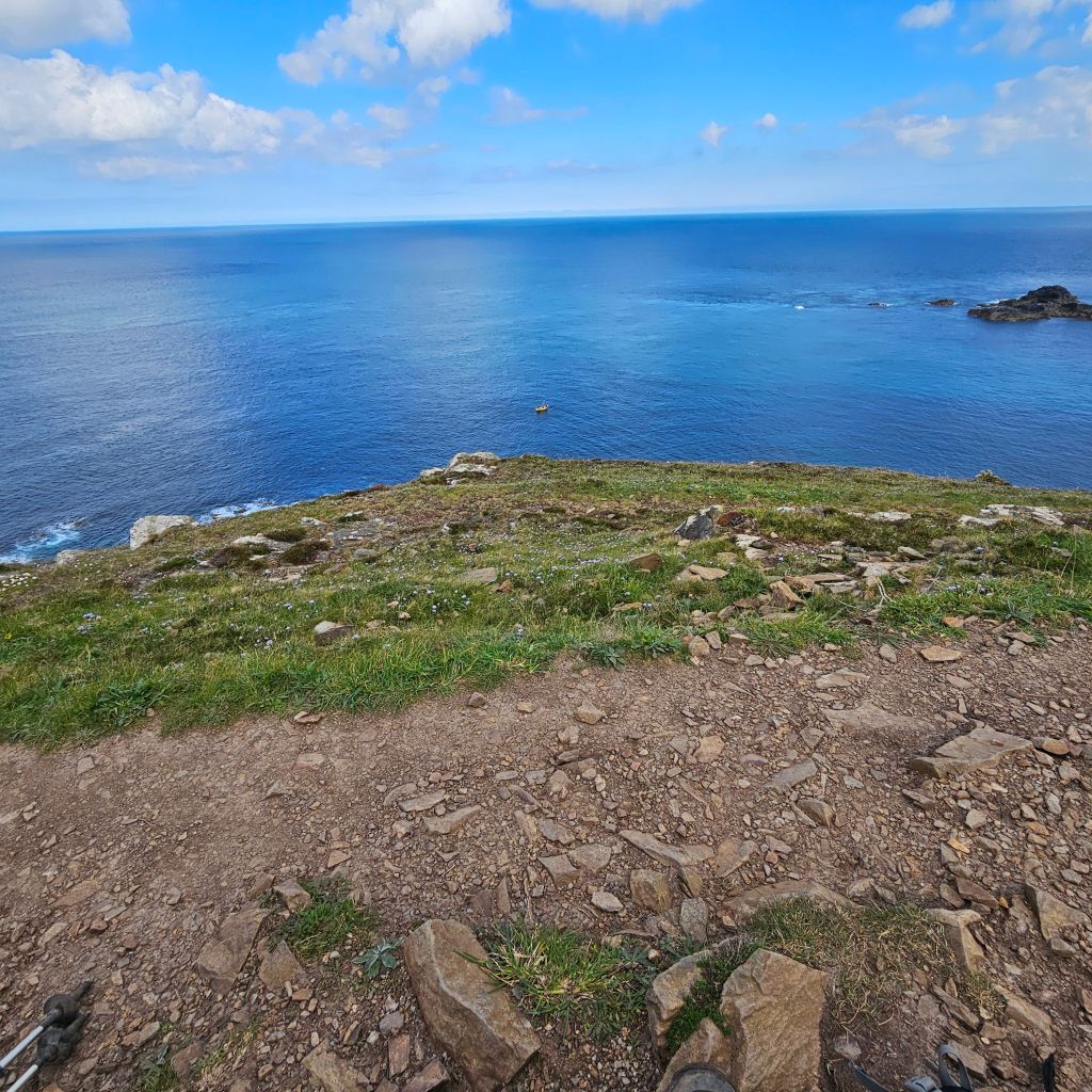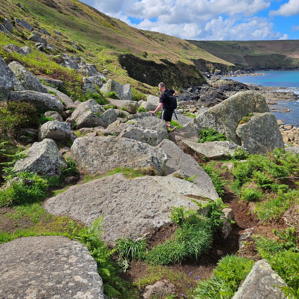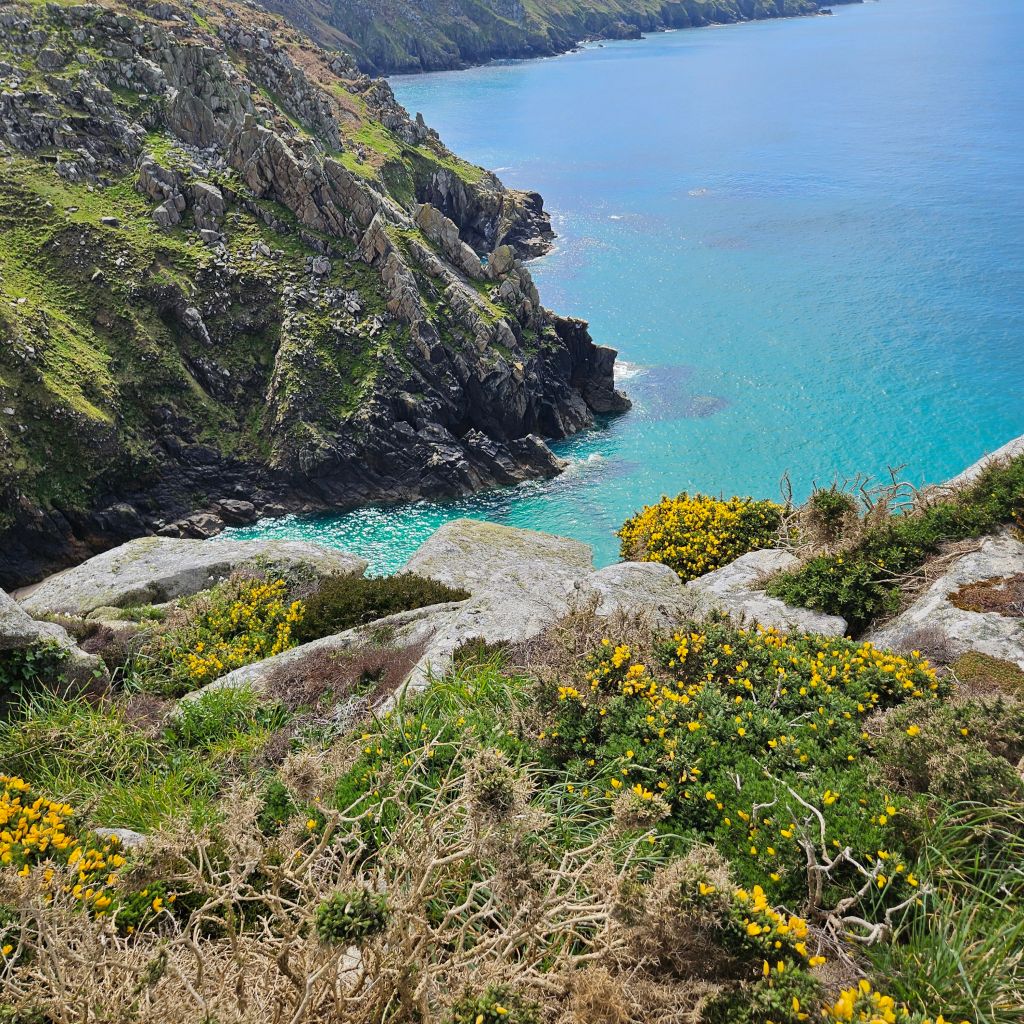 After yesterday surprise arrival it was great to meet Gav in a very sunny St Ives for what had been described as one of the toughest sections of the SWCP. The guide book describes it as having the character of remote and lonely, tough going with rock scrambles, and boggy lengths. But as I have said before, wiser people than me have told me that I will remember the tough sections and this section was tough. This is not laid out as a path, it is a rock face laid flat, with every single obstacle that has ever been naturally made. Everything was dandy walking through the waking streets of lovely St Ives, around the town and out along the back of Porthmeor Beach, and up on to the path to Claggy Point. From here the path becomes a side on mountain climb, but with some of the most amazing views experienced to date. You need big will power to lift your head to look at this wonderful section of path, stark cliffs, rock pinnacles, wonderful coves and sea colours that are beyond belief. A tough climb and decent around Carn Naun Point opens up to the beautiful River Cove and the Economy Cove. Gav in his shorts and trainer is tackling this like a Sunday afternoon walk, even when his trainers start to disintergrate. The going is really slow,, you just have to pick you way over, around and along huge boulders, and this seems incessant all the way to Zenor Cove. Now lesser men would bail out at this point go to the Tinners Arms, and have a nice afternoon in the pub. Oh how I had to fight that thought. More ups and downs take you on past Horseback Zawn, Pendor Cove and Veor Cove. It’s tough going but we plough on, eventually rising to be level with Gurnards Rock, and people even madder than us, who are climbing the sheer cliff faces and the rock stack at Ebal Rocks. You realise that this world is full of people who do challenge themselves and just love the outdoor world. The sun is shining, the winds are light and we can see in the distance, some distance the goal for today the lighthouse at Pendeen watch. As we turn Porthmeor Point we meet a couple sitting on the edge of the cliff watching a shoal of fish in the transluscent waters of Porthmeor Cove below. It is so difficult to describe the colours, hopefully the photos do it justice. We have managed most of the serious rocks and are now negotiating a bog, where the rocks are welcome assteppingg stones. Thelighthousee has now gon, and the old sayin, “If you think you are nearly there you are not comes back. Three more miles of tough ground, past Porthmoins Cove, Brandy’s, Whirl Pool, Wolf Rocks, Greeb Point, and the beautiful Portheras Cove. One last climb up to Pendeen Watch and the waiting family collection. Only one thing for it, straight back to the Tinners Arms for a well earned pint and dinner. They tell you its 14 miles, but believe you me, it’s more than that, a really tough but rewarding section.