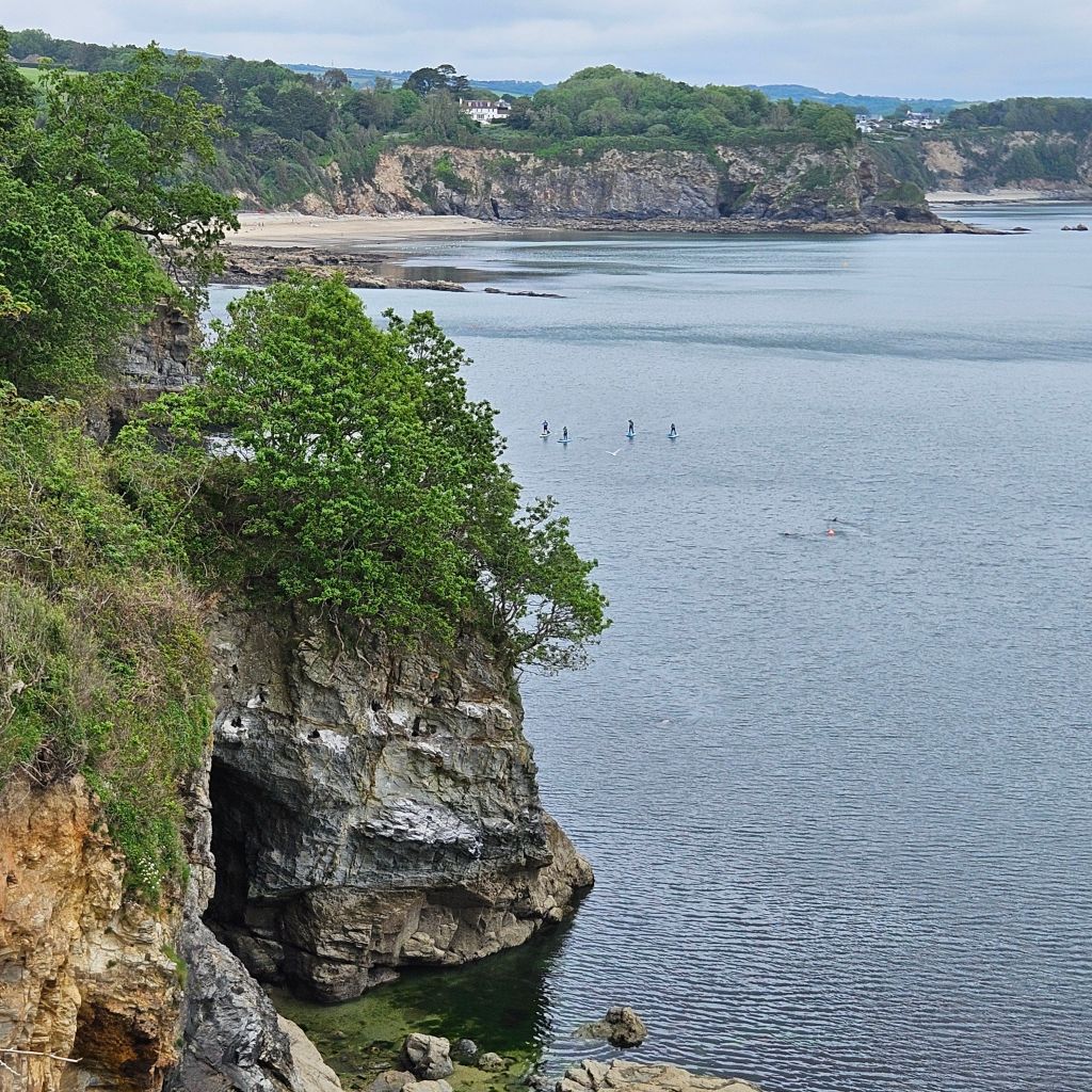 An overcast Wednesday morning on Mevagissey quay side saw Iain and I meet my Nephew Jamie, who had attempted to take the path on in the opposite direction yesterday, and found that it is not a simple walk. However, revived fit and raring to go we set off out of the lovely working port, with another first hour and a half of up and downs. Around Penare Point we arrive in the small hamlet of Pentewen, two pubs a lovely beach and a big but sensitive holiday park, a nice place for families I would say. We then climb steadily in mainly meadows and wooded areas until the headland at Black Head. The route then takes you high into more wooded areas, and the sea is a sound not a sight. This is still quite enchanting and we pass Ropehaven, where Madeleine once rented a cottage that was only accessible by sea. Two beautiful little coves wrap themselves around Silvermine point, where we have to tackle a flight of steps that seem to go to the depths of the earth, and then rise towards the sky. Fair to say the banter is quiet as we all recover and the beach at Porthpean offers tea, cake and oxygen. Jamie is now fully in his stride and enjoying going in the opposite direction to yesterday, he also has the knowledge that the worst of the contours are covered for the day. After Du Porth we arrive in Charlestown, which is something straight off of a film set, and indeed it is often used for screen and TV, most notably Poldark. From here the landscape changes with a more rural feel to our North. A stop at the lookout Station at Landrion Point is very interesting and is probably the highlight of the final hour of the walk today. From here you literally skirt a golf course, with grumpy men and women not acknowledging how polite we are being, and then you hit the industrial wasteland of West Par, china clay works. A lot of redundant mamouth factory buildings, with very few in operation. The path then follows a fenced in alley for a good kilometre and the lovely path feels just a little below par. Lovely to spend a day with Jamie and Iain, another 12 miles clocked up, 370 in total now.