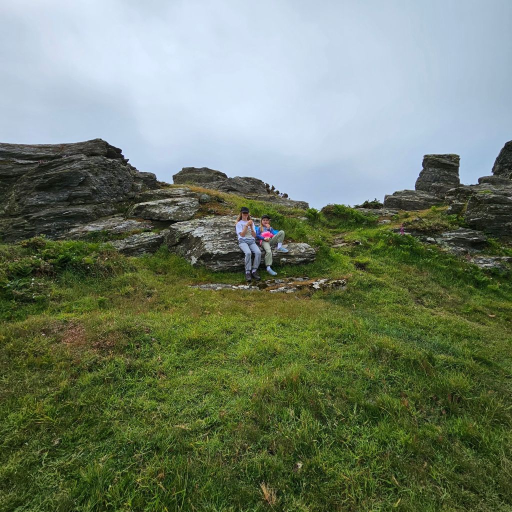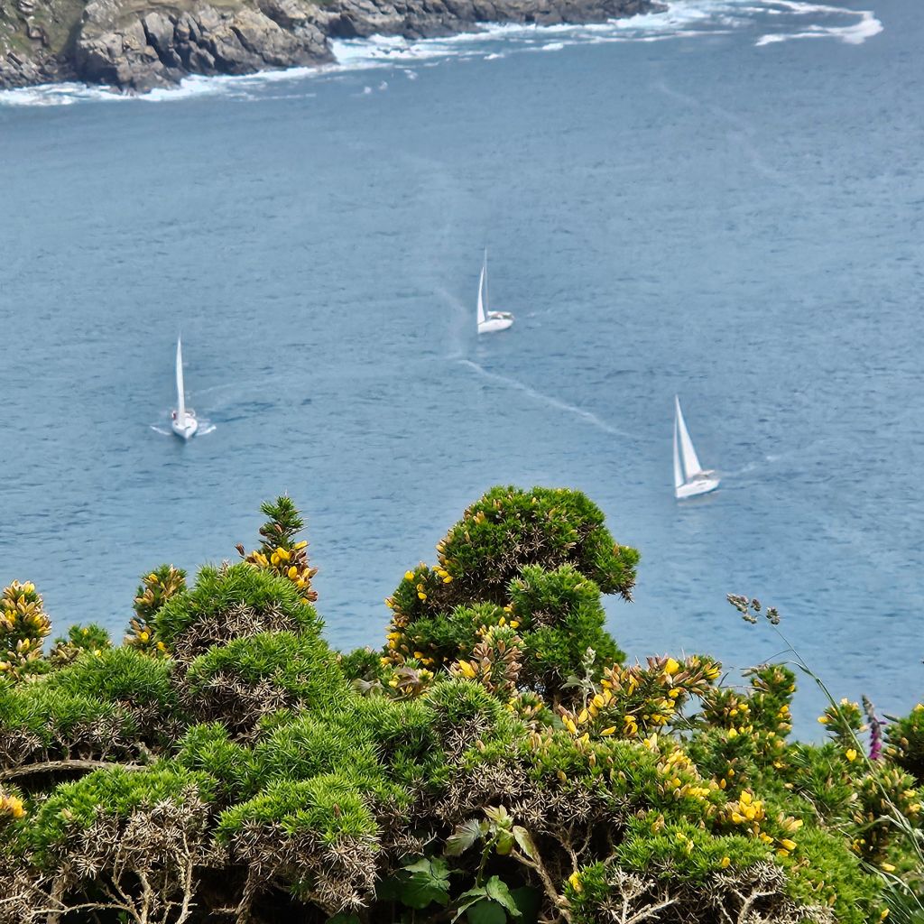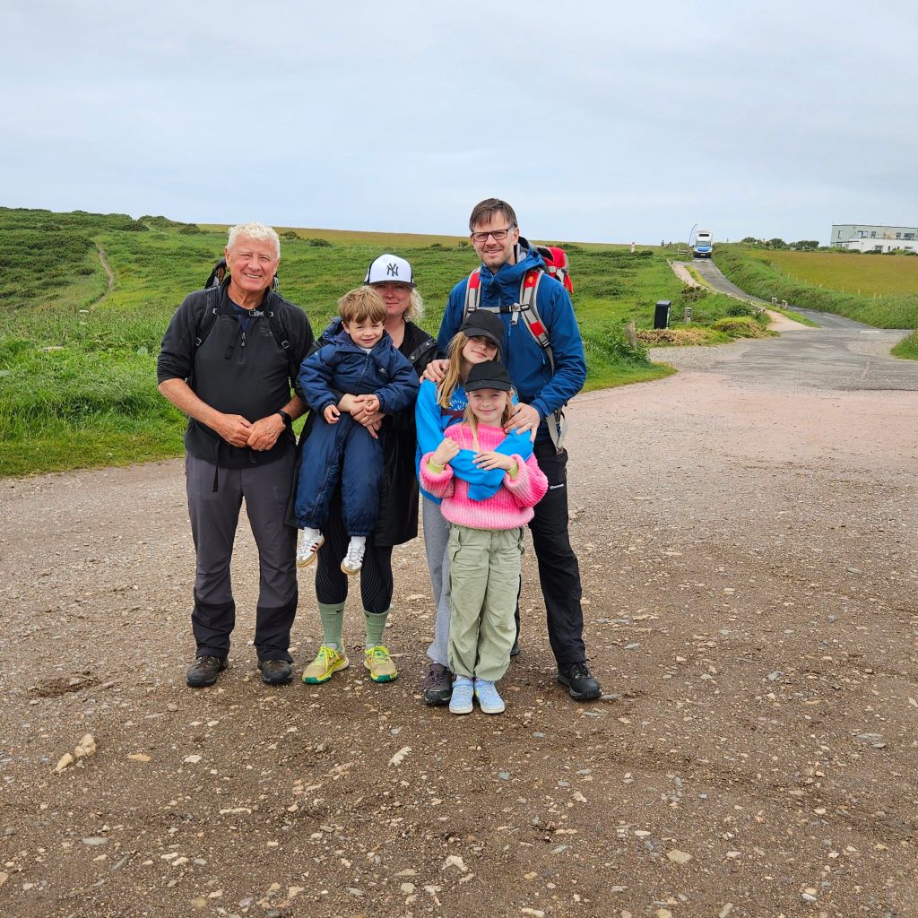 Today was a family affair with Lauren, Richard, Betty, Nina and even William joining me to complete the short section from Bolberry Down to Salcombe. We set of to the point where Richard and I left the path yesterday, to discover a completely different world from the one we left in the dense mizzle and rain yesterday. We had passed a hotel no more than 20 metres from the path and not even seen it yesterday, so it was a lovely experience to share this short section with all of the Kemp Tribe. Poor Richard had William in a back carrier after about 100 metres, and we soon headed into the valley at West Soar, a pretty steep downhill followed by an equally steep uphill, and to their credit and my pride everyone took on the challenge without complaint, with Nina leading the way up the steep slope. They then decided to sit on top of a very high rock at the summit, the confidence of youth is not good for the heart of the slightly older person. William was now awake and trying to run what was left of the section, so we stop for snacks. The snack stop refereshed all and we headed through the warren on a decent long cliff top section. Around and across Bolt Head and we come to the viewpoint at Sharp Tor. From here the whole estuary and Salcombe Harbour come in to view. The promise of Ice Creams at the end lifts the group and we head down into South Sands for an afternoon on the beach, with the “Chelsea set” : I forgot to pack my pink chinos so feel a bit out of place. A proper rest day tomorrow with the family and back to the big push on Friday.